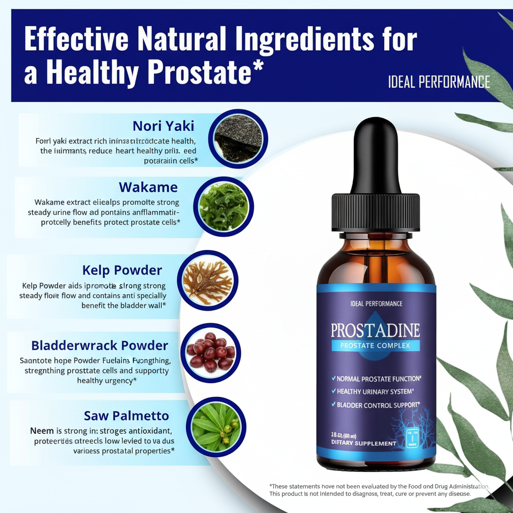 The Prostadine liquid formula is a blend of nine powerful natural extracts designed for comprehensive prostate and urinary tract support. The key components include Nori Yaki Extract Powder, Wakame Extract, and Kelp Powder, which are rich marine sources providing essential Iodine to aid in healthy prostate function and structural cell repair. These seaweed-derived ingredients also work to strengthen the bladder wall and promote a strong urine flow. The inclusion of Saw Palmetto is crucial for managing common symptoms associated with prostate enlargement (BPH) and reducing urinary discomfort. Furthermore, Neem extract contributes significant antibacterial and anti-inflammatory properties, offering protection against harmful bacteria and reducing oxidative stress within the urinary system. The combination ensures the prostate receives the necessary nutrients and defense mechanisms to operate optimally.